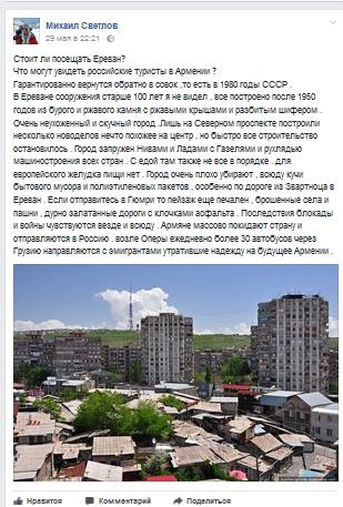 В Ереване сооружения старше 100 лет я не видел, все построено после 1950 годов из бурого и ржавого камня с ржавыми крышами и разбитым шифером. Очень неухоженный и скучный город. Лишь на Северном проспекте построили несколько новоделов, нечто похожее на центр, но быстро все строительство остановилось. Город запружен "Нивами" и "Ладами" с "Газелями" и рухлядью машиностроения всех стран. С едой там также не все в порядке, для европейского желудка пищи нет. Город очень плохо убирают, всюду кучи бытового мусора и полиэтиленовых пакетов, особенно по дороге из Звартноца в Ереван. Если отправитесь в Гюмри, то пейзаж еще печальнее, брошенные села и пашни, дурно залатанные дороги с клочками асфальта. Последствия блокады и войны чувствуются везде и всюду. Армяне массово покидают страну и отправляются в Россию. Возле Оперы ежедневно более 30 автобусов через Грузию направляются с эмигрантами, утратившими надежду на будущее Армении"...