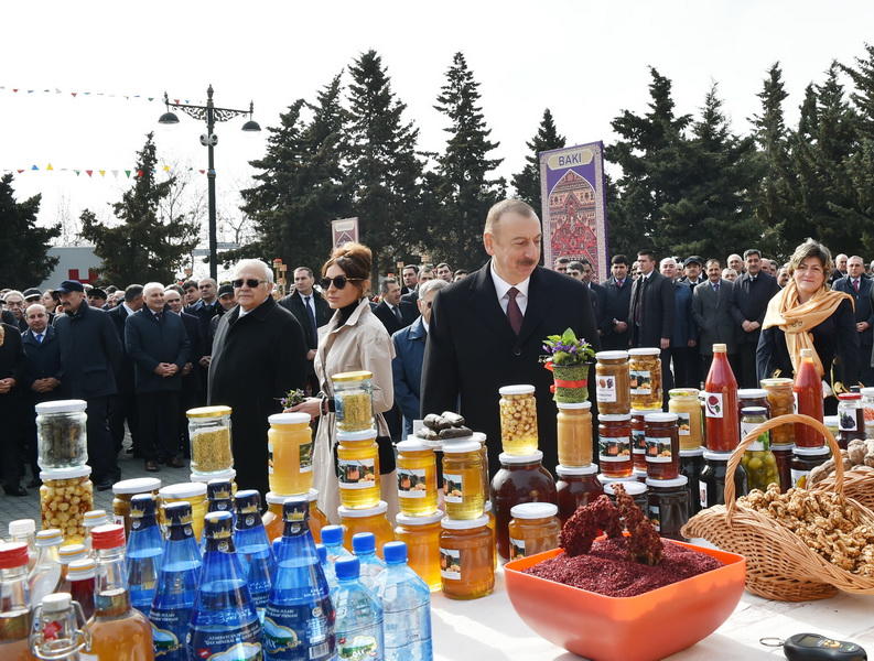 Президент Ильхам Алиев, Первая леди Мехрибан Алиева и другие участники торжества с интересом посмотрели эти сцены, ознакомились с образцами древних народных ремесел, азербайджанскими коврами, понаблюдали за выступлениями пехлеванов, борцов, послушали выступления фольклорных самодеятельных коллективов "Ненеляр", "Рафти", "Авасор", ритм-группы "Натиг", ашугов, коллектива театра-студии "Оюг" при Азербайджанском государственном кукольном театре.