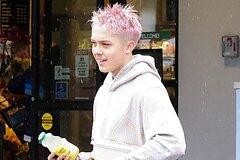 Уличные фотографы запечатлели подростка с небрежно уложенной стрижкой пикси с розовыми волосами. При этом сын знаменитостей был одет в джинсы с цветочными аппликациями и свитшот пастельного оттенка.