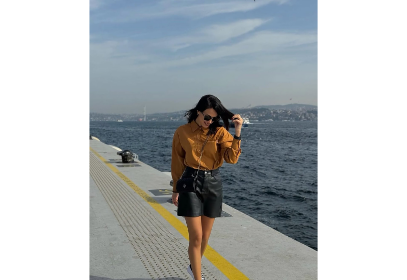 Айсель позирует на фоне современной архитектуры, а также знаменитого Босфорского пролива и мостов Стамбула, передавая атмосферу города и путешествующего настроения.