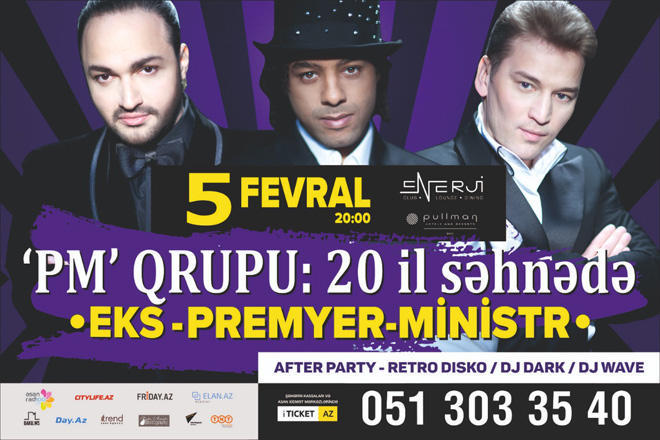 В Enerji Club Baku 5 февраля в 20.00 выступят экс-солисты группы "Премьер-министр" - группа "ПМ" с юбилейной программой "20 лет на сцене", сообщает Day.Az со ссылкой на Trend.