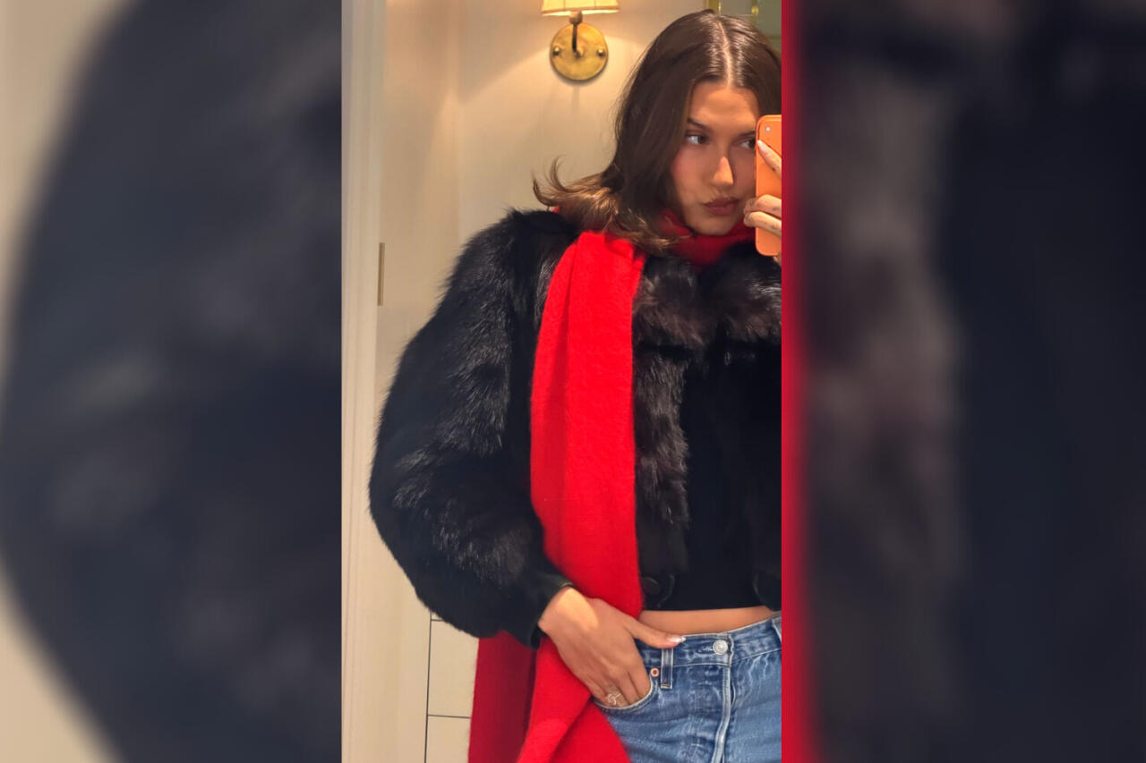 Хейли Бибер позировала в джинсах, черном топе, коричневой укороченной шубе, показав свой пресс, и красном шарфе. Волосы модель распустила и сделала легкий нюдовый макияж.