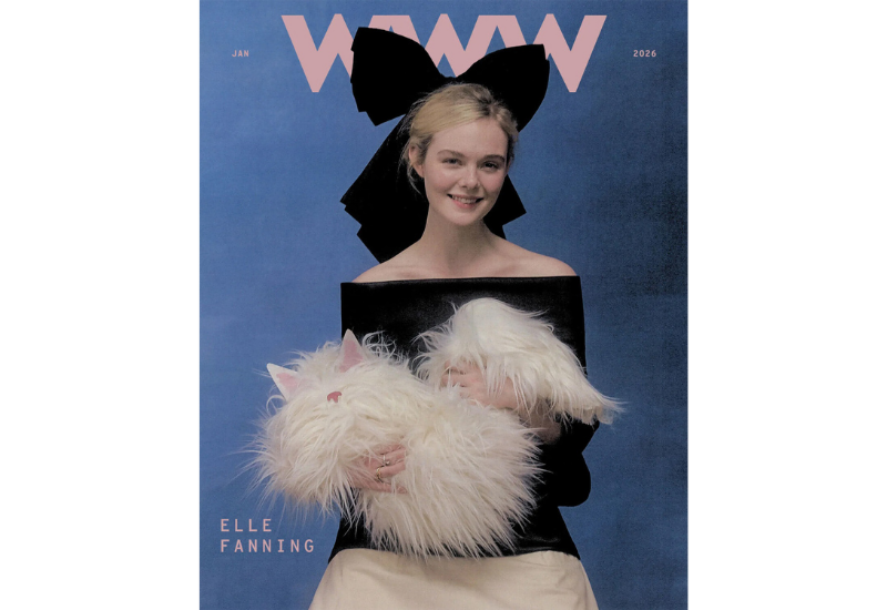 Эль Фаннинг позировала в черном бархатном топе и с бантом на голове. В руках актриса держала игрушечного кота. Фотографом и арт-директором съемки выступил Сильвестр Мако.