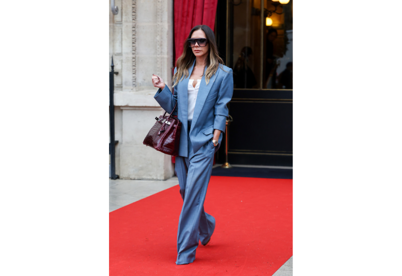 Виктория Бекхэм появилась перед камерами одна в Париже. Дизайнер предпочла для выхода строгий голубой костюм, белый корсетный топ и туфли с острым мысом. Образ дополнили солнцезащитные очки и сумка Birkin от Hermes.