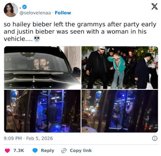 После церемонии "Грэмми" в Сети поднялся ажиотаж вокруг возможного кризиса в браке Джастина и Хейли Бибер. Причиной стали кадры с вечеринки в Polo Lounge отеля Beverly Hills, которую супруги покинули порознь.