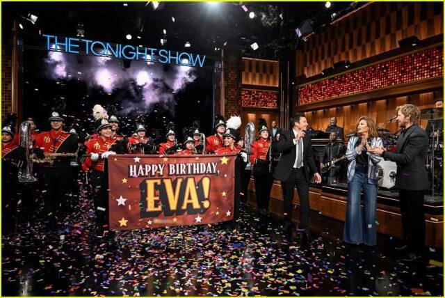 Во-вторых, свой 52-й день рождения отмечает его супруга Ева Мендес. В честь этого съемочная группа устроила актрисе сюрприз в виде концерта прямо во время интервью.