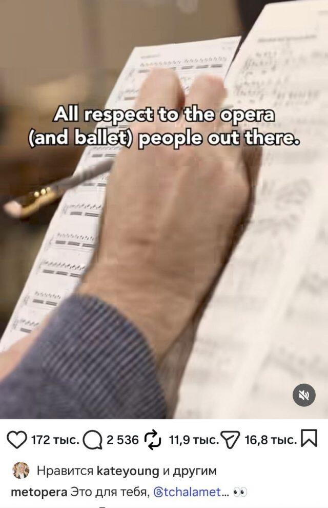 После Тимоти раскритиковали Лос‑Анджелесская и Метрополитен‑опера в Нью‑Йорке. Последняя опубликовала видео, на котором показала, как сложно работать в опере, и сопроводила пост подписью: "Это для тебя, Тимоти Шаламе".