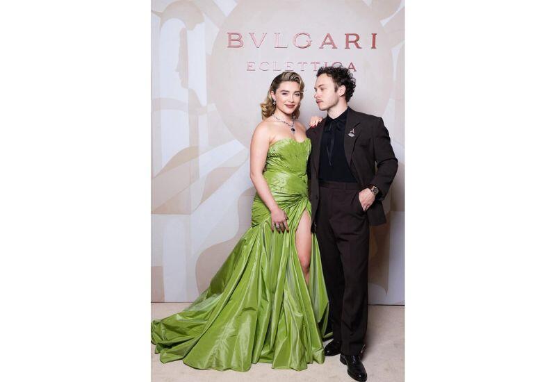 Флоренс Пью с Финном Коулом посетила закрытый гала-ужин Bvlgari в Милане. Актриса снялась, положив руку на бойфренда. Она предстала перед камерой в зеленом макси-платье с разрезом до бедра и украшениях. Артист появился на закрытом мероприятии в черной рубашке, коричневом брючном костюме и туфлях.