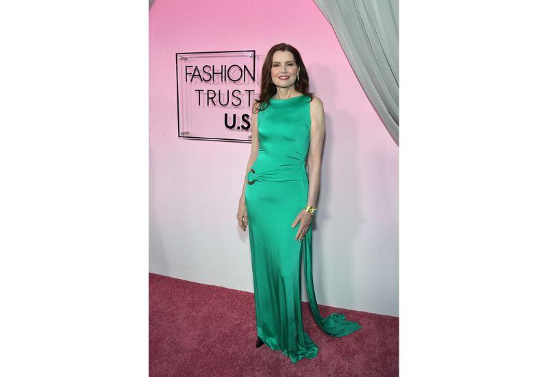 70-летняя Джина Дэвис пришла на церемонию вручения премии Fashion Trust US Awards в Лос-Анджелесе. Актриса позировала перед фотографами в зеленом облегающем макси-платье, которое сочетала с черными туфлями на каблуках, золотыми часами и серьгами. Звезда "Стюарта Литтла" вышла на публику с уложенными в локоны волосами и макияжем со стрелками черного цвета, румянами и блеском для губ.