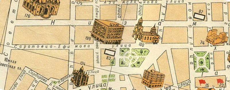 Итак, мы начинаем свою прогулку от здания Республиканской прокуратуры, откуда берет начало улица Нигяр Рафибейли. Она спускается к Министерству Внутренних Дел, весьма масштабному зданию. Затем мы пересекаем дорогу и выходим к Центральному универмагу.