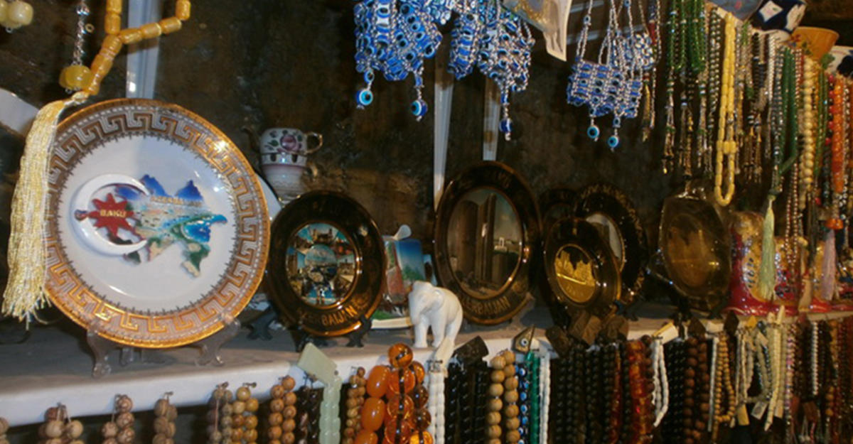 Продавец поведал, что самыми популярными у иностранцев являются картины, нарисованные черным золотом, маленькие коврики, сотканные сельскими мастерицами, традиционные сумки-хурджуры, азербайджанские головные уборы - арахчын, тарелки разных форм, ковровые кошельки, шарфы, платки, аксессуары и четки.