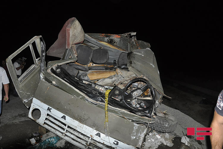 Груженый камнем грузовик "КамАЗ", за рулем которого находился житель села Гаралар Сабирабадского района Гадир Самидов, столкнулся с другим грузовиком той же марки, перевозившим щебень.