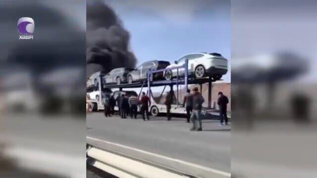 В Азербайджане внезапно загорелся грузовой автомобиль с двухэтажным прицепом.