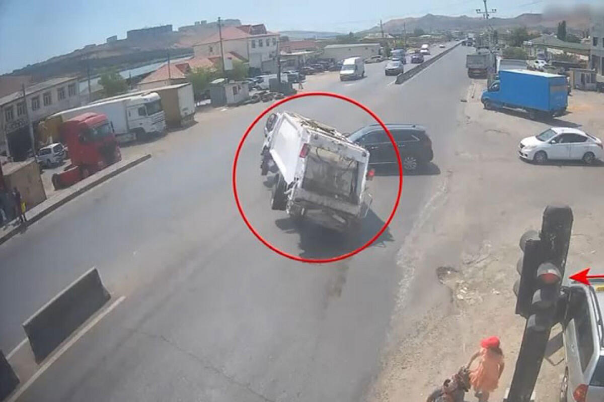 Мусоровоз протаранил легковушку и опрокинулся в Баку - ВИДЕО