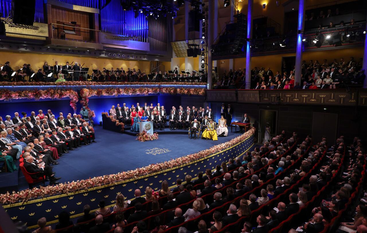 После вступительного слова председателя соответствующего Нобелевского комитета лауреаты 2025 года выходили на сцену, по традиции украшенную тысячами свежих цветов, чтобы принять золотые медали и индивидуальные дипломы.