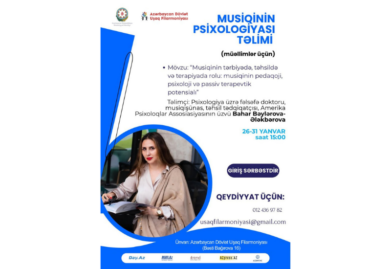 Азербайджанская государственная детская филармония впервые запускает обучающие тренинги по музыкальной психологии. С 26 по 31 января в 15:00 доктор философии по психологии, музыковед, исследователь в области образования, член Американской психологической ассоциации Бахар Бейлярова-Алекперова проведет обучающие курсы по музыкальной психологии для педагогов.