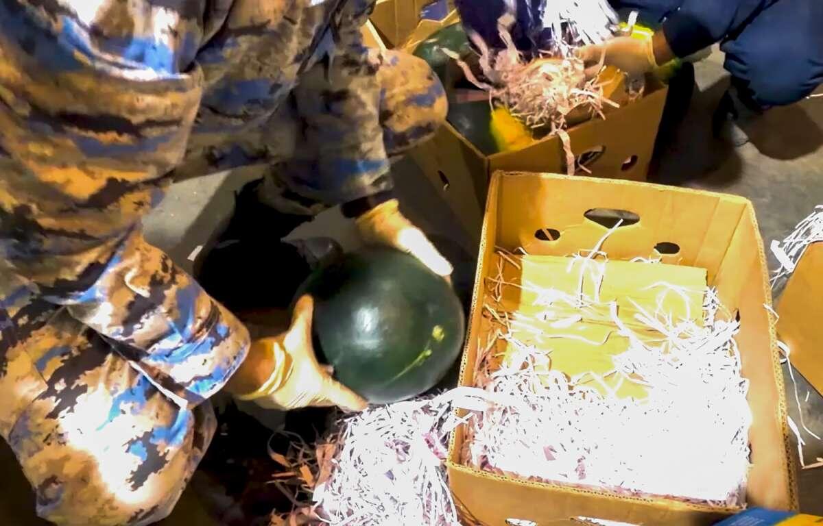 "В результате мероприятий, проведенных сотрудниками Астаринского таможенного управления, было выявлено и изъято из незаконного оборота особо крупное количество наркотических средств. Наркотики были обнаружены на таможенном посту "Джянуб-Астара" в транспортном средстве, перевозившем свежие арбузы из Ирана в Россию транзитом через территорию Азербайджана", - сообщили в ГТК.