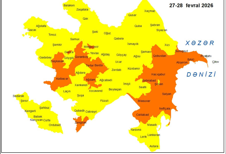 Государственная гидрометеорологическая служба выпустила желтое и оранжевое предупреждения о сильном ветре, который ожидается в Баку и на Абшеронском полуострове, а также в регионах страны 27-28 февраля.