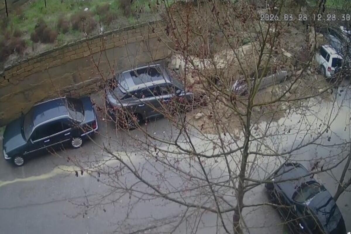 Обрушившийся забор раздавил несколько автомобилей в Баку - ВИДЕО