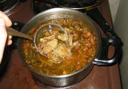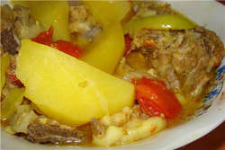 Добавить к мясу лук, помидоры, алычу, приправы и тушить в небольшом количестве бульона до готовности. Подавать с лимоном и свежими огурцами.