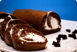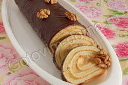 Остудить получившуюся глазурь до температуры тела. Смазать рулет шоколадной глазурью и украсить грецкими орехами.