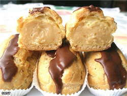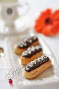 Эклеры аккуратно надрезать сбоку и удалить ложкой влажный мякиш (удалять мякиш необязательно). Наполнить эклеры заварным кремом (можно аккуратно сделать небольшое отверстие в эклерах и наполнить их кремом при помощи кондитерского мешка).