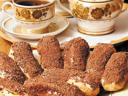 На застеленный пергаментом противень из кондитерского мешка отсадить заварное тесто в виде жгутиков, длиной 5-6 см и шириной около 2 см.