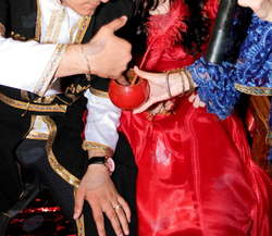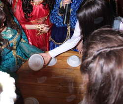Дальше началось самое интересное. Ведущая мероприятия, видимо, не раз проводила хнаяхты и хорошо была осведомлена о всех тонкостях этого обряда. Она посадила нашу виновницу торжества и, приговаривая какие-то слова, стала на голову ей класть шоколадки в виде золотых монеток. Это тоже древний обычай, целью которого является желание благосостояния молодым. Раньше, конечно, на голову невесты клались не шоколадки в золотистой обертке, а настоящие золотые монеты. Ну, опустим эту тонкость, как я уже сказала, меняются времена - меняются и традиции. И если когда-то все обряды носили практический характер, то в наши дни осталась только символическая их составляющая.