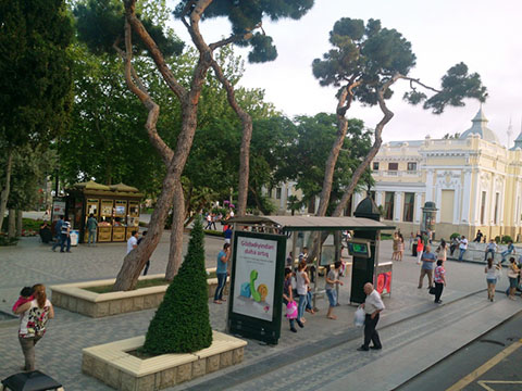 Как я узнала из Интернета, собираются "двухэтажки" на площади Азадлыг, но касса расположена на улице У.Гаджибейли, около главпочтамта. Дверь кассы была заперта, и я направилась к площади, решив, что билеты, наверное, продаются непосредственно на месте отправки. Но и на Азадлыг признаков продажи билетов в тур не оказалось.