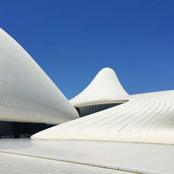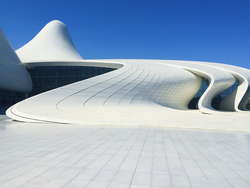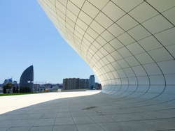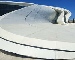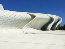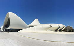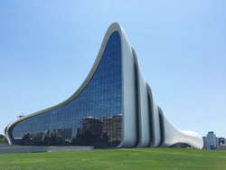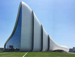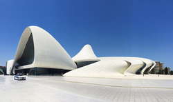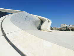 Центр Гейдара Алиева - это огромное строение площадью более 57 тысяч квадратных метров, в проекте которого практически не использовано прямых линий. На официальном сайте Центра есть интересное описание: "Само здание по форме представляет собой волнообразное устремление ввысь и плавное слияние с землей. Подобная структура олицетворяет не только постмодернистский стиль архитектуры, но и продолжительность и бесконечность. Линии же на здании символизируют связь прошлого с будущим. В ходе строительства здания была создана сеть из железных конструкций общей протяженностью 90 км. При монтаже кровли площадью 4 га было использовано 12027 панелей особого состава и разного размера, в форме различных геометрических фигур - треугольника, прямоугольника, трапеции, параллелограмма. Белый цвет здания символизирует светлое будущее и использован с целью выделения присутствующих здесь особых элементов. Благодаря белому цвету лучи света перемещаются по поверхности здания и подчёркивают выделяющиеся части здания".