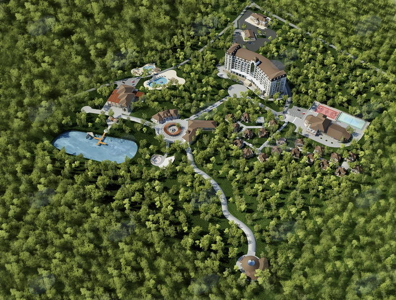 Согласно информации, общая площадь строительного участка - 27 тыс. 839 кв. метров. Для организации удобного и всестороннего отдыха гостей в комплексе были спроектированы необходимые объекты и инженерные сооружения - 7-этажная гостиница с подвальным помещением, ресторан, SPA-центр, два развлекательных и торговых центра, кафе, театр под открытым небом, здание регистрации и услуг, 16 3-4-комнатных коттеджей.