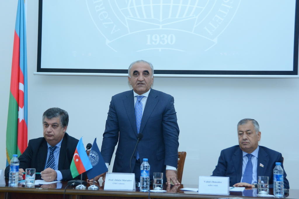 Поздравив профессорско-преподавательский состав, студентов UNEC по случаю Дня государственной независимости, ректор, профессор Адалат Мурадов сделал небольшой экскурс в прошлое. Он отметил, что азербайджанский народ счастлив, так как является гражданином свободного и независимого государства. Отрадно, что государственная независимость, защищенная великим лидером, еще больше укрепляется верным продолжателем Президентом Ильхамом Алиевым.