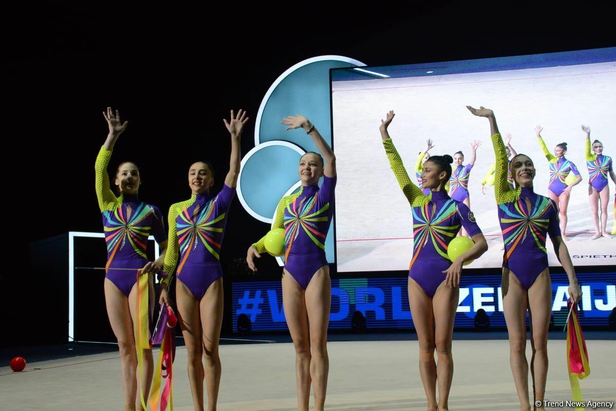 Команда Азербайджана на Кубке мира в Баку занимает первое промежуточное место в упражнении с тремя лентами и двумя мячами - ФОТО