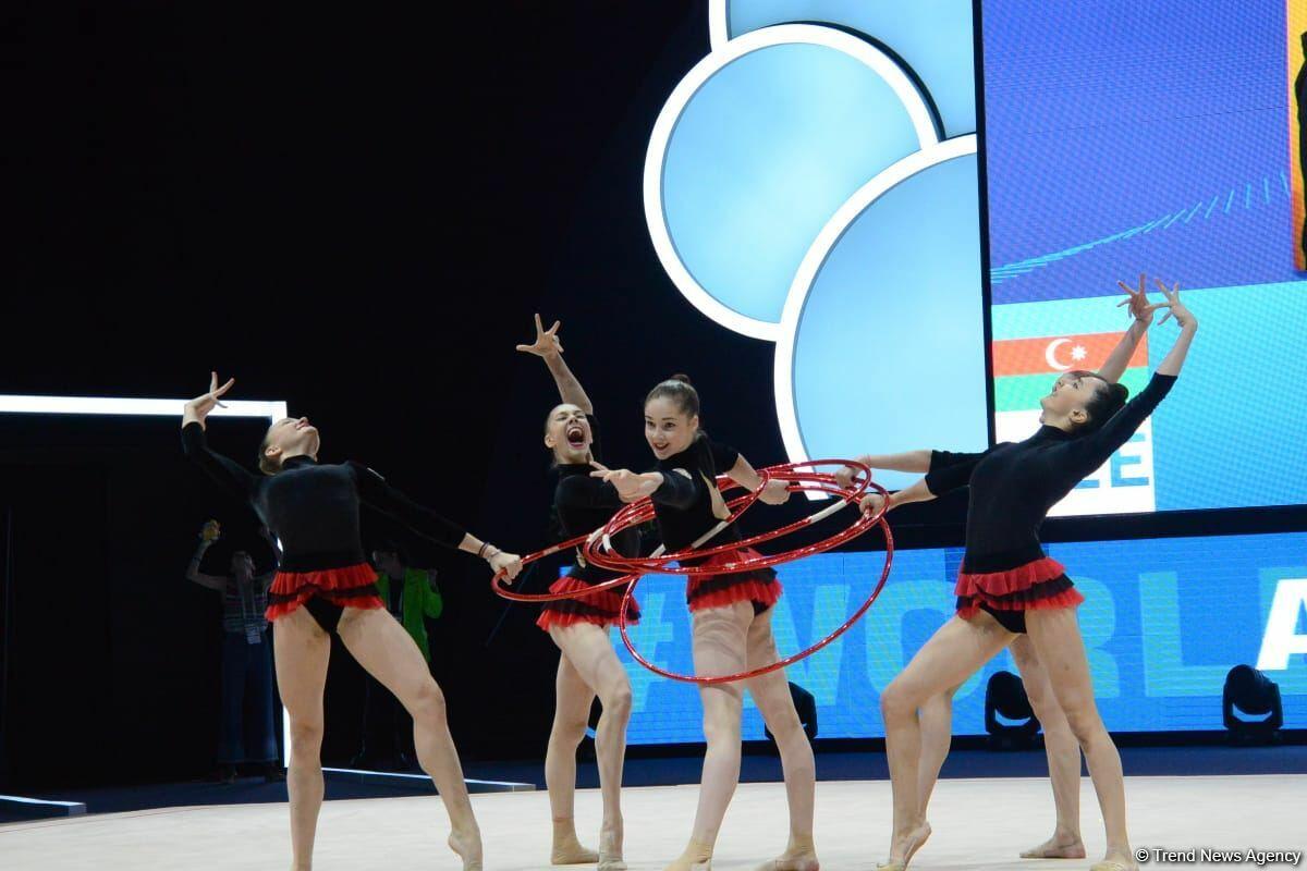 Команда Азербайджана заняла первое место в групповых упражнениях с пятью обручами на Кубке мира в Баку - ФОТО