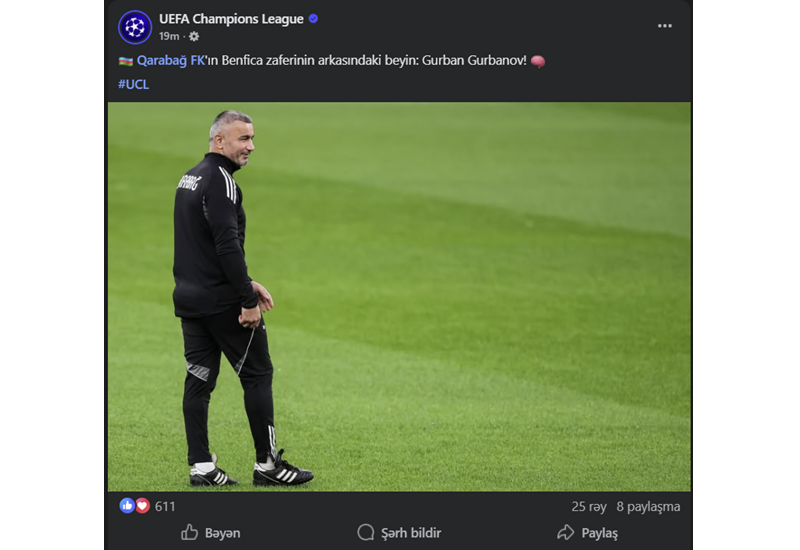 Официальная страница Лиги чемпионов в Facebook посвятила публикацию главному тренеру "Карабаха" Гурбану Гурбанову.
