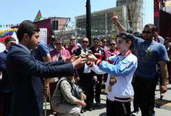 Тренер-учитель Сеймур Гулиев, поднявшись на установленную на площади сцену, зажег факел.