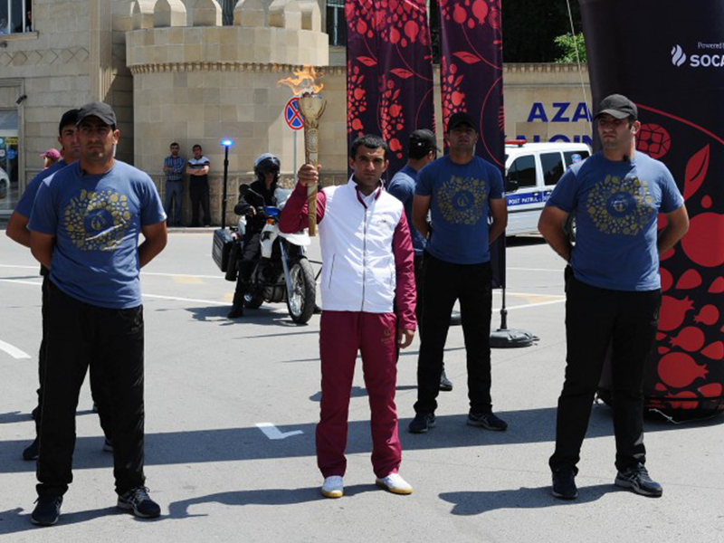 Затем начался пробег 10 факелоносцев. По-очереди, передавая факел друг другу и пройдя через улицу Кероглу, они вышли на проспект Гейдара Алиева. Факелоносцы, преодолев дистанцию в 2,28 километра, достигли площади напротив Центра Гейдара Алиева.