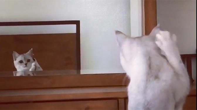 Кот увидел свое отражение в зеркале и понял, кто он такой - ВИДЕО