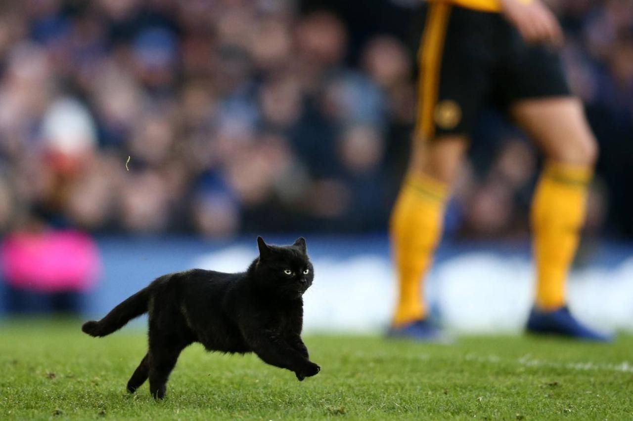Матч Английской премьер-лиги (АПЛ) между "Эвертоном" и "Вулверхэмптоном" был внезапно прерван из-за выбежавшего на поле кота. Кадры со злобным нарушителем были опубликованы в Twitter.