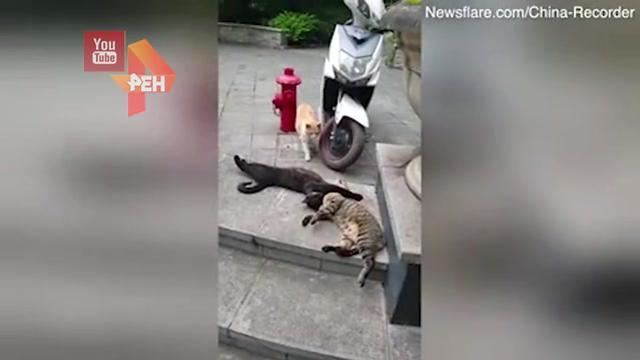 В Китае сняли на видео "любовный треугольник", в котором оказались уличные кошки.
