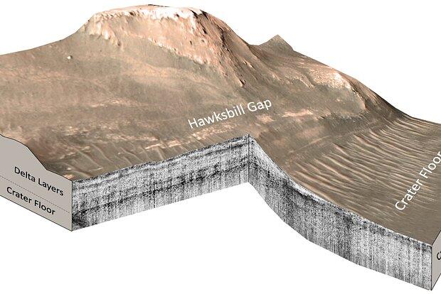 По словам авторов, равномерность и горизонтальность отложений нижней части дельты, наблюдаемые на радиолокационных сечениях, указывают на то, что они отлагались в спокойной озерной среде. Она могла служить подходящей средой для обитания живых организмов.