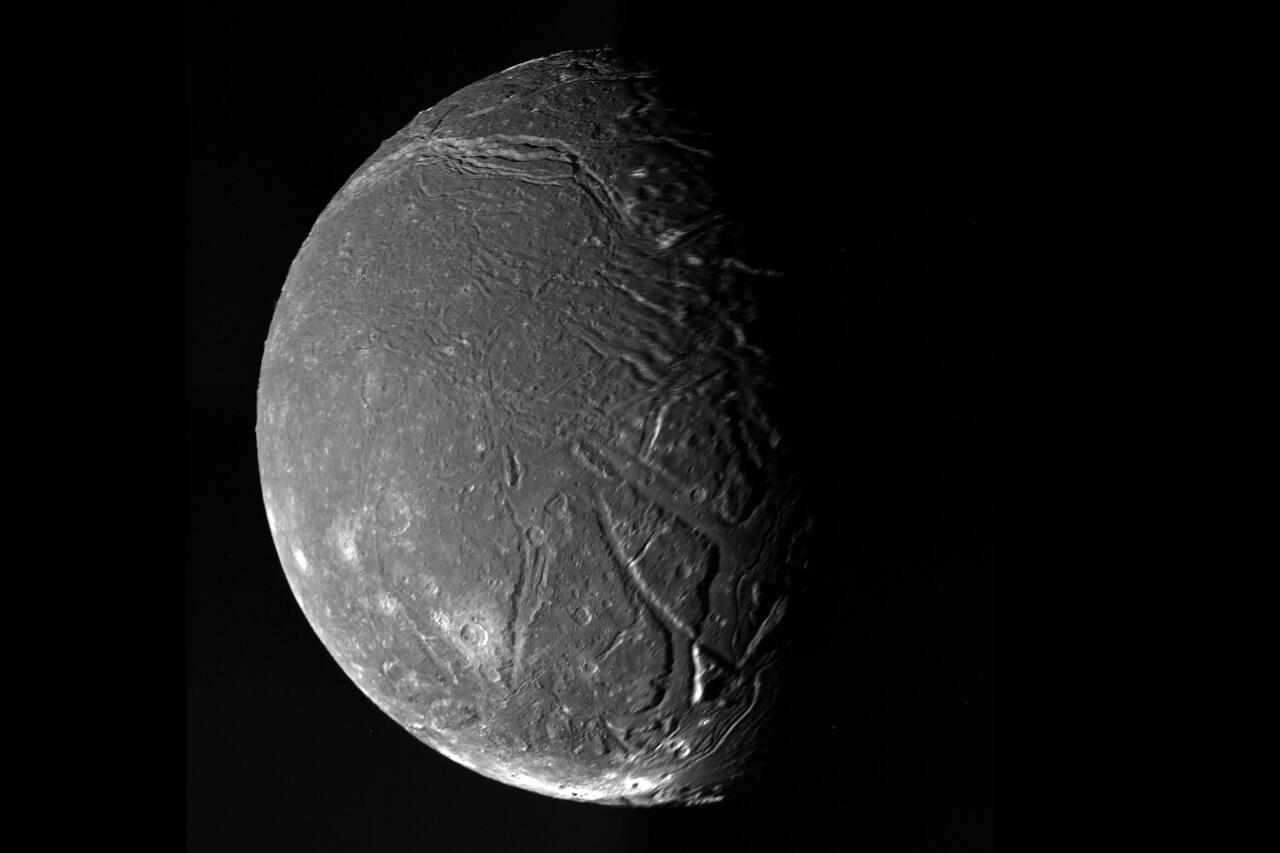 Ариэль - самый яркий спутник Урана и четвертый по величине в его системе. Его поверхность сочетает древние кратеры и относительно молодые области, вероятно сформированные извержениями криовулканов. Ученые обратили внимание на разломы, хребты и грабены - структуры, указывающие на сильное внутреннее и внешнее напряжение.