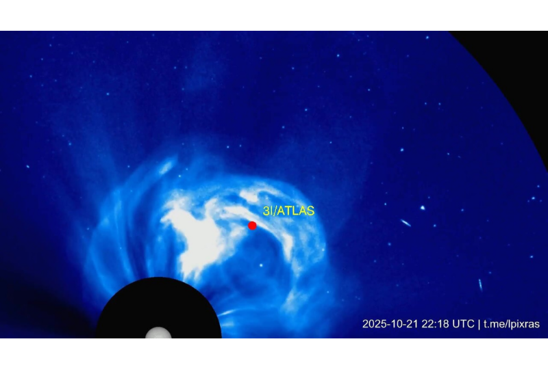 Мощный корональный выброс массы (КВМ) после сегодняшней вспышки на Солнце направлен точно (в пределах 10-20 градусов) в сторону межзвездного объекта 3I/ATLAS, который в настоящее время находится на противоположной стороне Солнца примерно в 200 миллионах километров.
