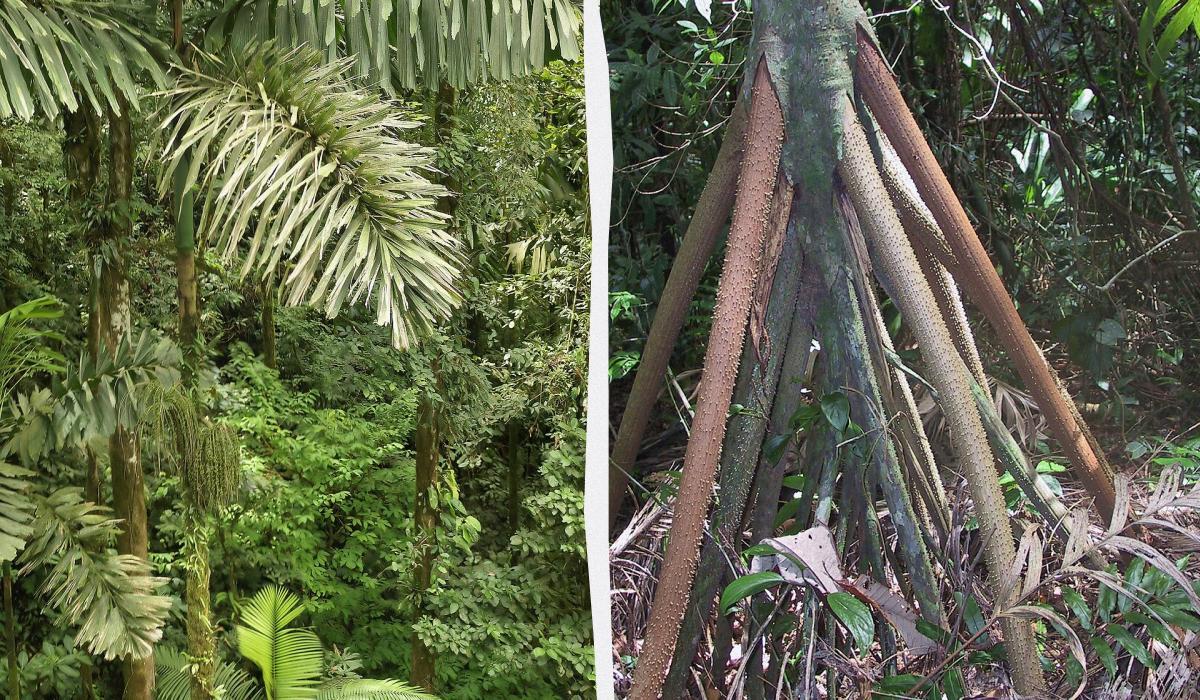 Если взглянуть на сократею голокоренную, может показаться, что она стоит будто на сваях. Ее основной ствол поднимается не непосредственно из земли, как у привычных нам деревьев, а из конусообразного пучка корней, возвышающихся над землей на несколько десятков сантиметров.