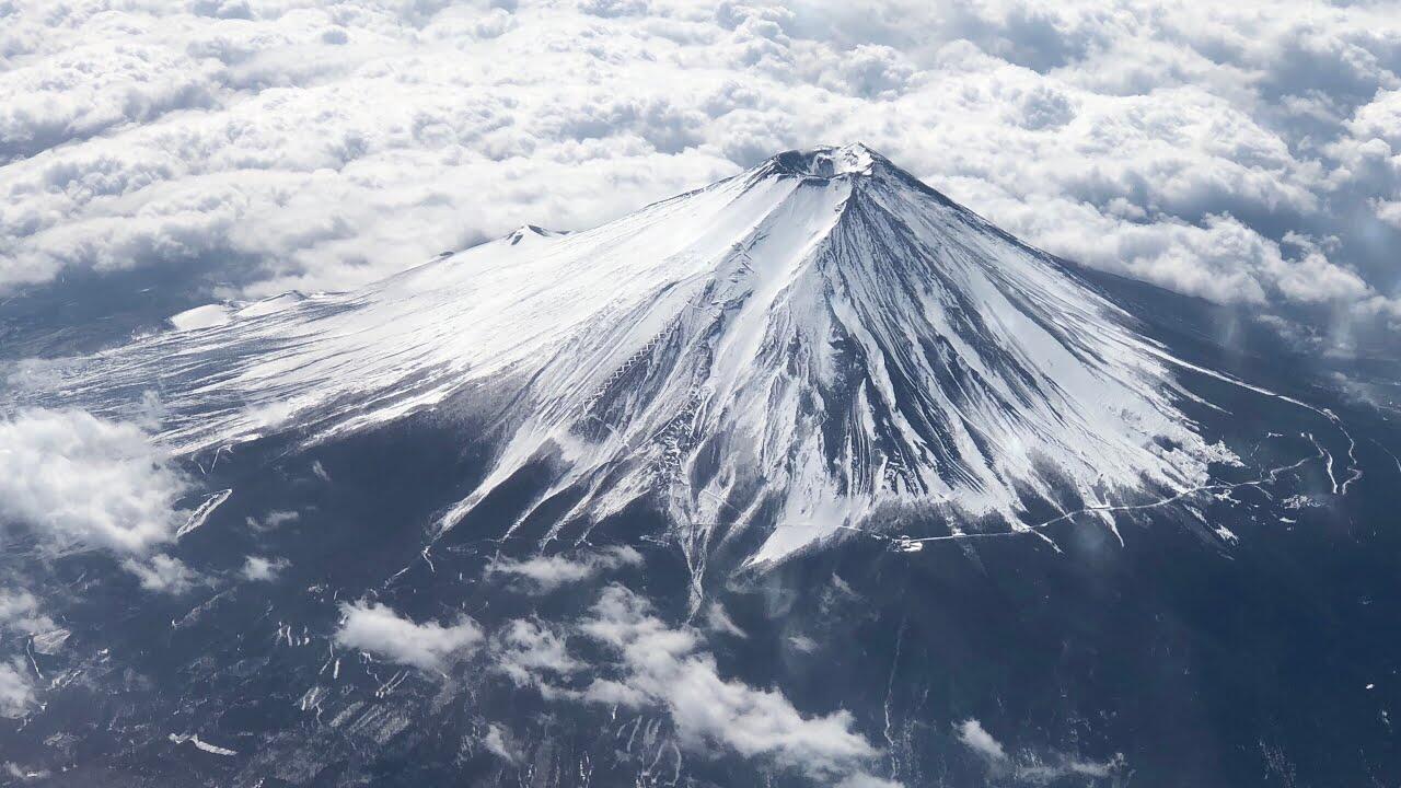 Во время пролета можно было увидеть гору Фудзи. Склоны были покрыты свежим снегом.