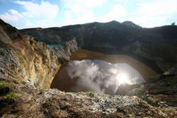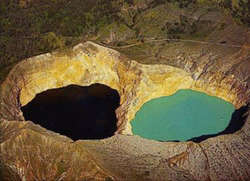 А вот на острове Флорес в Индонезии, на вершине одного из вулканов, располагаются не одно, а сразу три "цветных" озера, причем с водой разных цветов. В одном из них вода ярко-красная, в другом - нежно-голубая, а в третьем - белая, как молоко.
