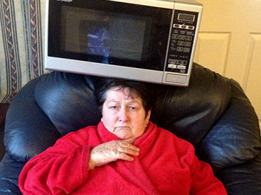 На каждой фотографии Джеми изображает свою бабушку с различными домашними предметами на голове - вплоть до гладильной доски и микроволновки. У женщины удивительная способность удерживать тяжелые предметы на голове. Выражение лица и ее красный халат никогда не меняются. Буквально за несколько дней Twitter-страница "Вещи на моей бабушке", которую открыл внук женщины, набрала более 40000 поклонников.
