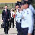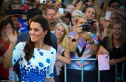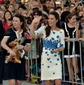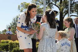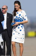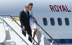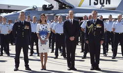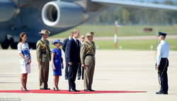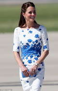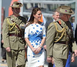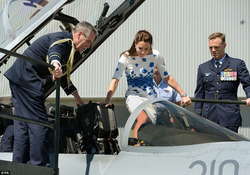 Монархи посетили Королевскую базу военно-воздушных сил "Эмберли", где встретились с семьями военных. Кэтрин была одета в белое платье с синим цветочным принтом от L. K. Bennett, синие замшевые лодочки и держала в руке кобальтовый клатч Oroton - однако столь элегантный наряд не помешал ей грациозно забраться в один из самолетов.
