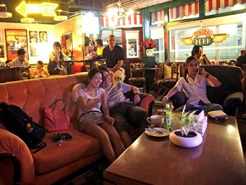 Посетители тематического кафе на Манхэттене смогут не только приобрести различные напитки, но и увидеть декорации к сериалу, в том числе знаменитый диван, на котором любили сидеть герои "Друзей". В качестве музыкального сопровождения выбрана песня Smelly Cat и другие композиции, исполнявшиеся в шоу.