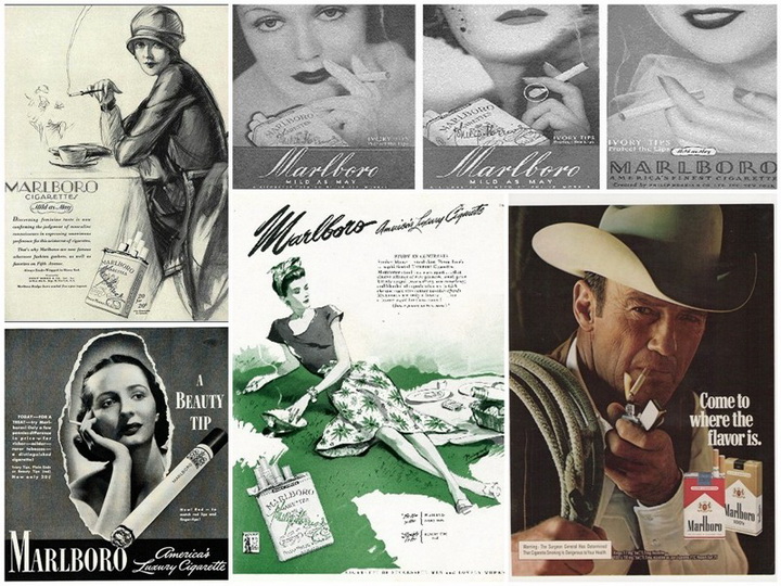 Сигареты "Marlboro" впервые на рынке появились в 1924 году. Они позиционировались как сигареты для стильных, утончённых и элегантных женщин. Для их рекламы компания наняла актрису Мэй Уэст - секс-символ тех времён - и даже изменила цвет верхней части сигареты на тёмно-красный. Он идеально сочетался с помадой и лаком для ногтей!